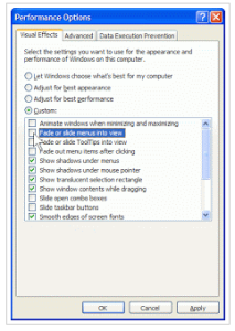 3.ตรงแท็บ Visual Effects tab ในช่องของ Performance Options dialog box, ยกเลิก Fade หรือ slide menus into view check box.