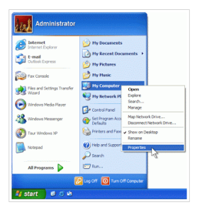 Windows XP อาจจะปรับแต่งลูกเล่นหรือ visual effects ในการแสดงผลที่สวยงาม และหน้าตาการใช้งานที่น่าสนใจ ซึ่งหนึ่งในรูปแบบของการตั้งค่าได้แก่การปรับค่าการจางหายหรือ fade in เมนูการใช้งาน ซึ่งจะส่งผลต่อการทำงานที่ดูต่อเนื่องจนเราอาจจะไม่สังเกตเห็น อย่างไรก็ตามค่าของ visual effect นี้จะส่งผลให้การแสดงผลของเมนูใช้งานของวินโดว์ XP ปรากฏขึ้นช้ากว่าปกติ สำหรับคอมพิวเตอร์ที่เร็วๆ แรงๆ ก็ไม่มีปัญหาในการโหลดหรือทำงาน แต่ถ้าคอมของเราเป็นรุ่นเก่าหรือช้าอยู่แล้ว เราสามารถปรับแต่งให้เมนูการใช้งานปรากฏขึ้นมาอย่างเร็วด้วยการทำตามขั้นตอนต่อไปนี้ครับ 1. คลิก Start. คลิกขวาที่ My Computer, และคลิก Properties.