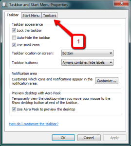 การเข้ามาใช้งานวินโดวส์ครั้งต่อไป เมื่อคลิกขวาตรงTaskbar แล้วเลือกคำสั่ง properties จะไม่มีแท็บ Toolbar ให้เลือก