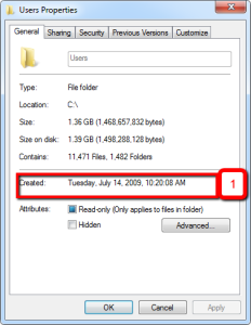 เรียก windows Explorer ขึ้นมาทำงานแล้วเข้าไปที่ฟลเดอร์ Users คลิกขลาเลือกคำสั่ง properties ตรงโฟลเดอร์ชื่อแอ็กเคาร์ที่เรใช้ตอนติดตั้งวินโดวส์ แล้วให้ไปดูตรงแท็บ General ตรงบรรทัด Created ก็จะรู้วันที่ทำการติดตั้งวินโดวส์