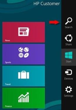 Search charm – ค้นหาแอพ ค่าปรับตั้งหรือไฟล์ต่าง ๆ การค้นหาโดยใช้ Charms เป็นระบบที่ไวต่อสิ่งแวดล้อม หมายความว่าถ้าคุณกำลังใช้งานแอพพลเคชั่นรูปภาพ คุณสามารถค้นหารูปภาพได้โดยตรงจากแอพพลิเคชั่นแทนการเปิดแถบค้นหาเพื่อค้นหารูปภาพ
