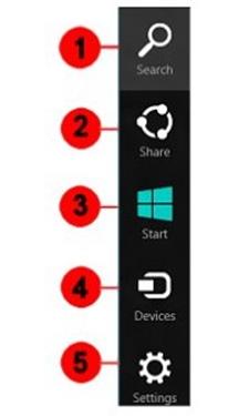 ใหม่ทำให้สามารถเรียกค้นรายการที่ใช้งานบ่อยได้โดยสะดวก ไม่ว่าคุณจะอยู่ที่ไหนในวินโดว์ กำลังทำงานอยู่บนหน้าจอสตาร์ท เดสก์ทอปวินโดว์หรือแอพพลิเคชั่นใด ก็สามารถใช้ Charms ได้ตลอดเวลาเปิด charm โดยกดปุ่ม Windows +C