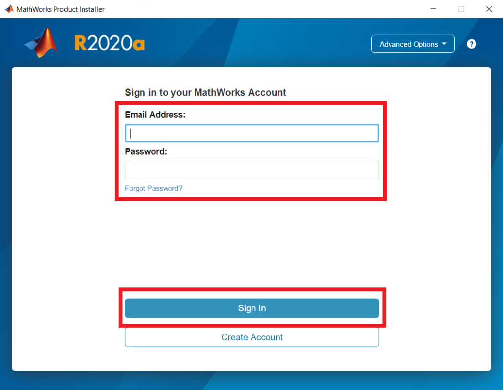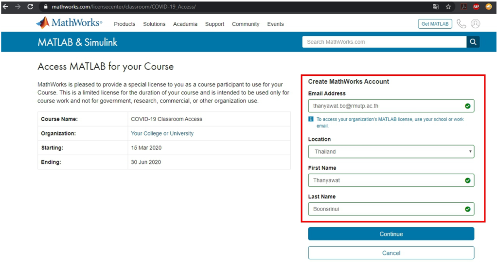 1. ลงทะเบียนเข้าใช้งานผ่าน URL https://www.mathworks.com/licensecenter/classroom/COVID-19_Access/ ในครั้งแรกให้สมัครเข้าใช้งานก่อนโดยเลือกที่ปุ่ม Create Account