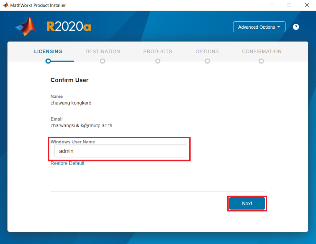 6. หน้า Confirm User ใส่ชื่อที่ใช้ log in Computer ที่ใช้ติดตั้งโปรแกรม กด Next (สำคัญมาก หากใส่ชื่อผิด ไม่สามารถใช้งานโปรแกรมได้)