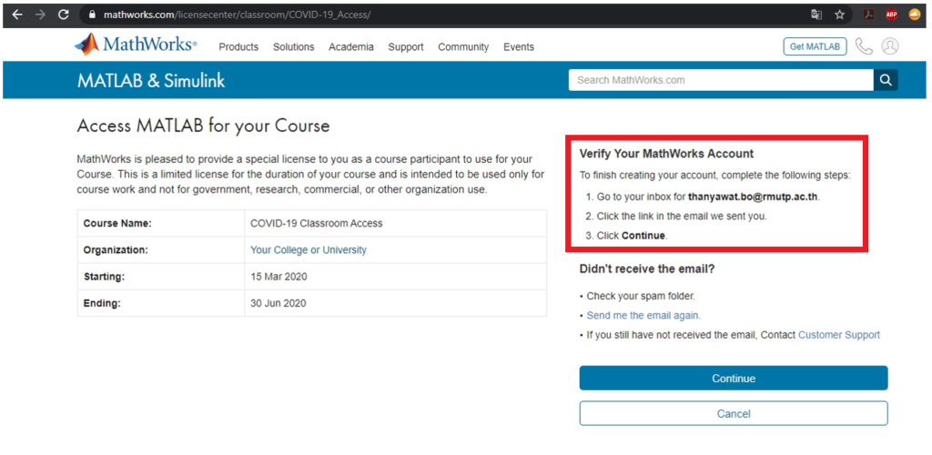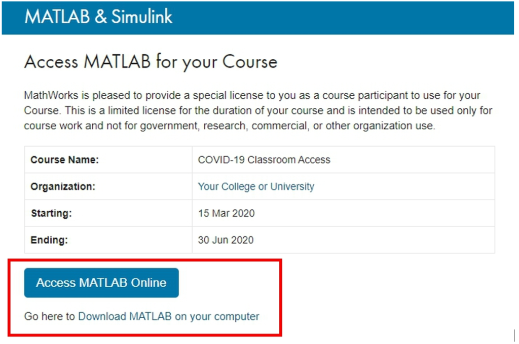จากสถานการณ์แพร่ระบาดของไวรัส Covid – 19 ทางมหาวิทยาลัยเทคโนโลยีราชมงคลพระนครได้รับการสนับสนุนให้สามารถใช้งานโปรแกรมการเรียนการสอน MATLAB ได้ฟรีทุกโมดูล ตั้งแต่บัดนี้จนถึง 30 มิถุนายน 2563 โดยสามารถใช้ได้บนเว็บเบราว์เซอร์ หรือสามารถดาวน์โหลดติดตั้งในเครื่องคอมพิวเตอร์ก็ได้ แต่การใช้งานจะเน้นไปทางการเรียนการสอนเท่านั้น ไม่สามารถใช้อ้างอิงงานวิจัยได้ โดยมีวิธีการเข้าใช้งานดังนี้