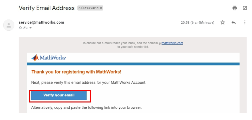 4. เข้าไปตรวจสอบ Email Address ที่เราใช้ในการสมัคร เพื่อทำการยืนยันการสมัคร (Verify Email Address) โดยการกดปุ่ม Verify your email