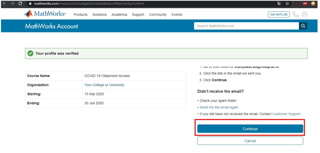 5. เมื่อคลิก Verify your email จะมาที่หน้าเว็บแบบดังรูป แสดงว่า Verify Email Address เรียบร้อยแล้วให้กลับไปที่หน้าเว็บสมัครที่เปิดทิ้งไว้ แล้วคลิ๊กไปที่ปุ่ม Continue