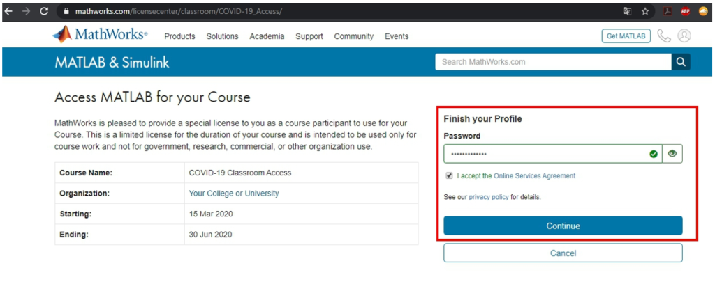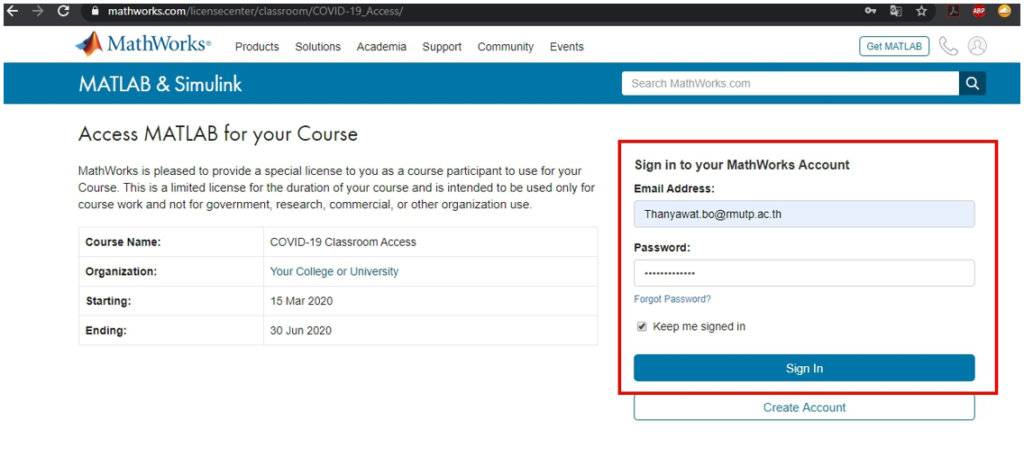 1.ให้เข้าไปที่ลิงค์ https://www.mathworks.com/licensecenter/classroom/COVID-19_Access/ ทำการใส่ Email Address กับ Password ที่เราได้สมัครไว้ข้างต้น แล้วคลิ๊ก Sign In